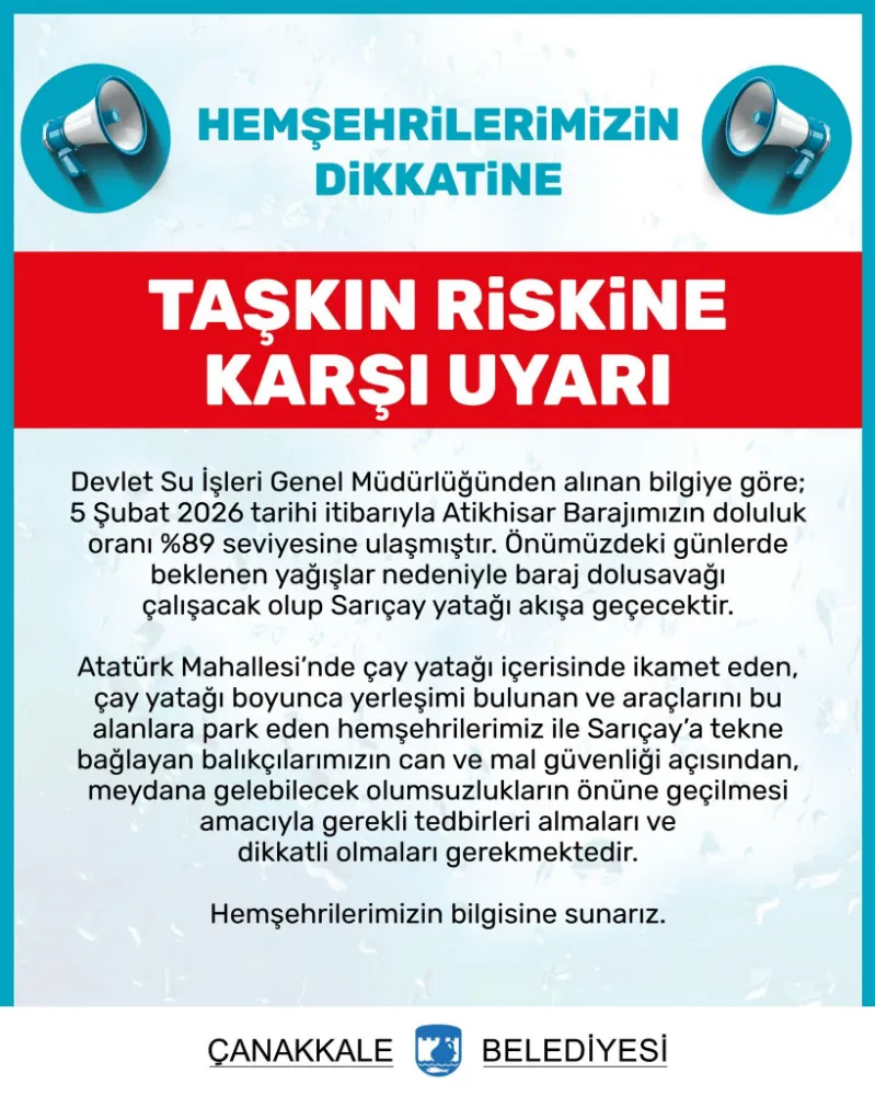 Çanakkale Belediyesi ve DSİ yetkilileri tarafından yapılan ortak duyuruda, barajdan bırakılacak fazla suyun Sarıçay yatağı üzerinden denize deşarj edileceği belirtildi. Bu süreçte su seviyesinin aniden yükselebileceğine dikkat çekilerek uyarılarda bulunuldu: