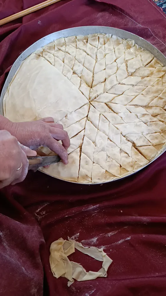 Köy evinde bir araya gelen kadınlar özel mayaladıkları hamurları tek tek özenle yufka halinde açtılar. Ahşap yaslaçlarda açılan yufkalar bir süre dinlendirilip kurutulduktan sonra 40 kat olarak tepsiye döşenirken, aralarına öğütülmüş ceviz ya da badem serpiştirildi.